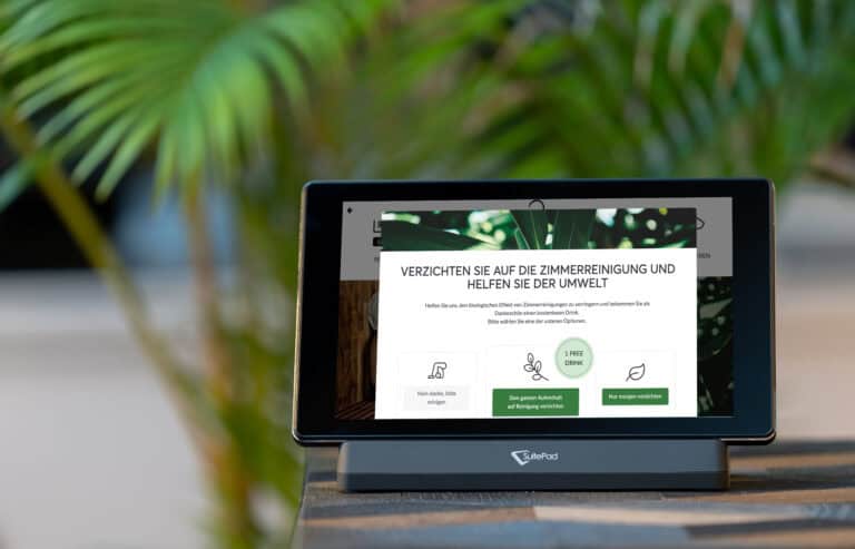 Zusätzlich zu den vielfältigen Service-Angeboten integriert SuitePad das Thema Nachhaltigkeit aktiv in sein Konzept: durch die sogenannte Green Option. Diese kann direkt über das Tablet gebucht werden und motiviert Gäste mit mehrtägigem Aufenthalt, auf die tägliche Zimmerreinigung zu verzichten. Auf diese Weise werden sie unmittelbar in den Umweltschutz einbezogen und erleben Nachhaltigkeit direkt. Der Verzicht auf die tägliche Reinigung hat nicht nur positive ökologische Effekte, sondern ermöglicht auch erhebliche Einsparungen bei Strom-, Wasser- und Reinigungsmittelverbrauch. So kann ein Hotel mit rund 150 Zimmern jährlich etwa 270.000 Liter Wasser und 1.800 Liter Waschmittel einsparen.